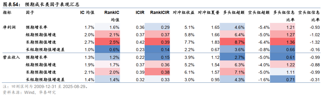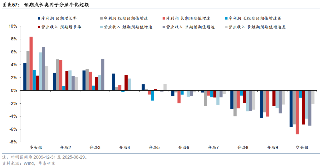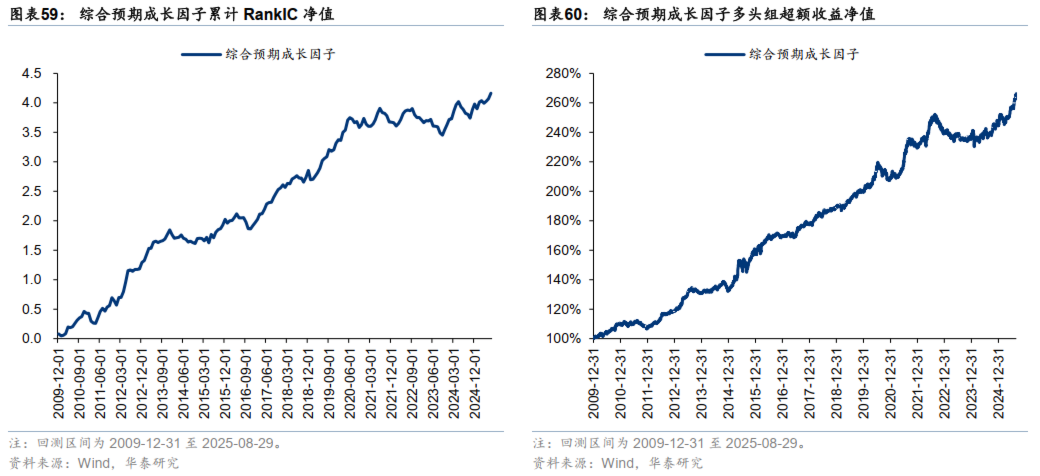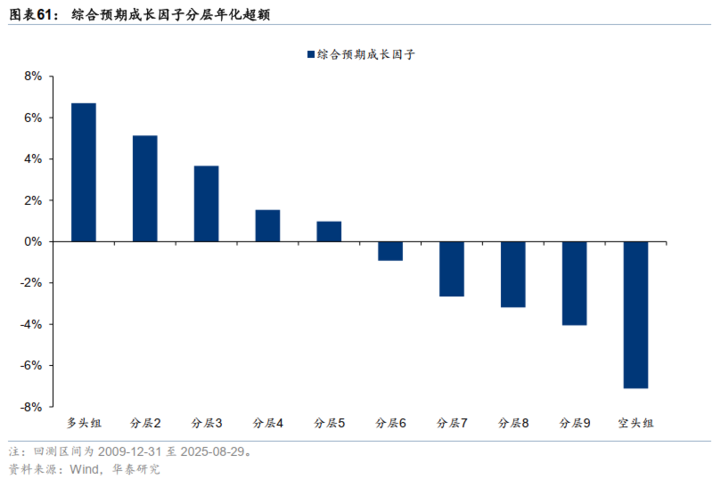 观察测试结果,可以发现综合预期成长因子分层单调性良好,多头组虽时序上存在波动但在2015年、2025年等科技成长风格占优区间进攻型强。