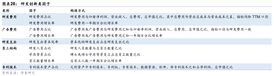 本节尝试基于研发费用、研发支出、广告费用、员工结构、专利技术等指标构建一系列企业研发创新类因子,并进行实证测试。构造因子的方法及含义汇总如下。