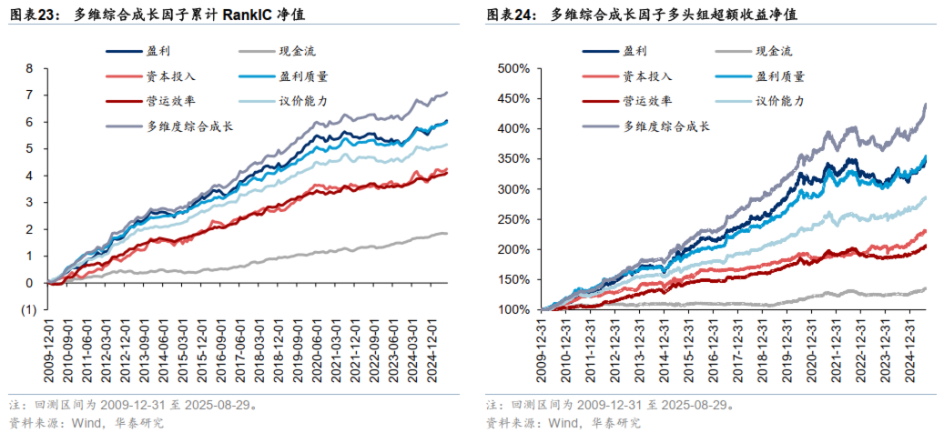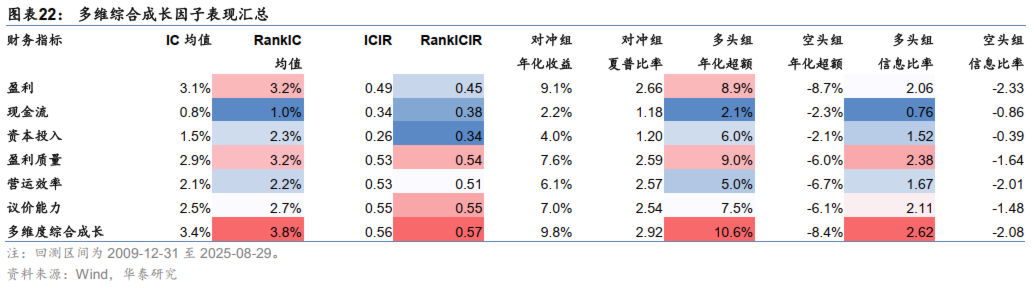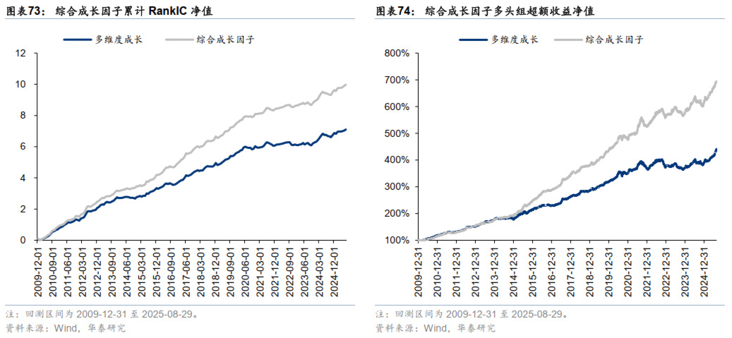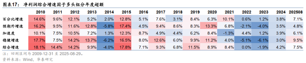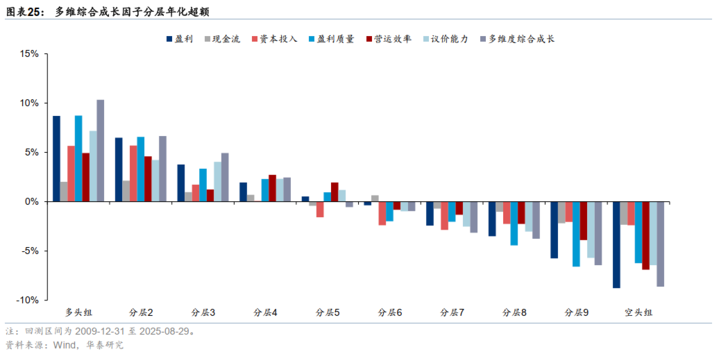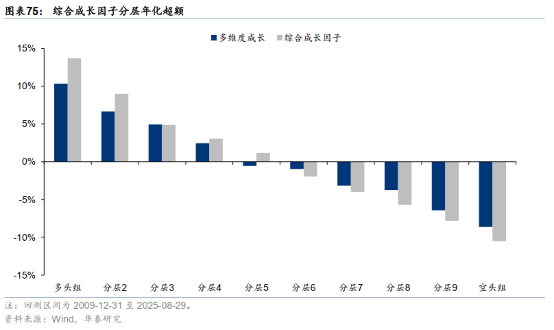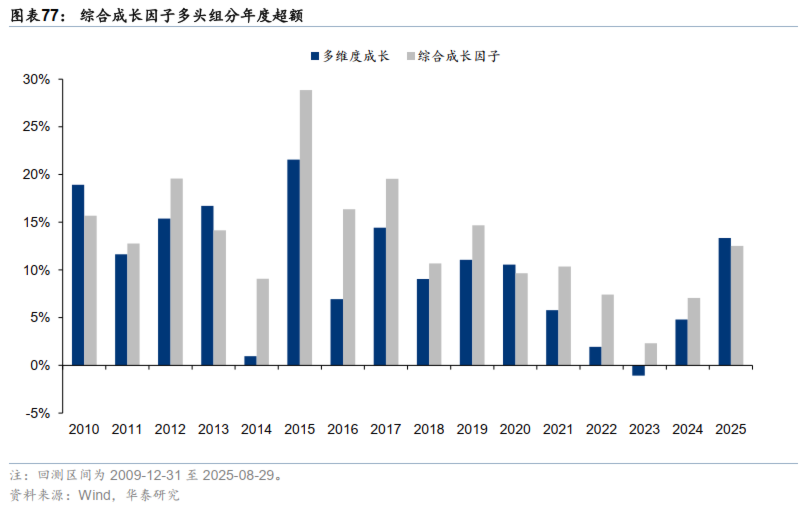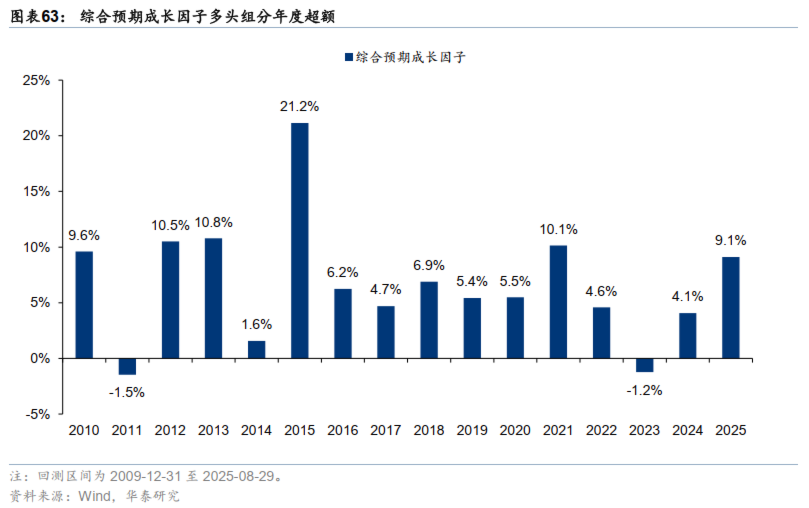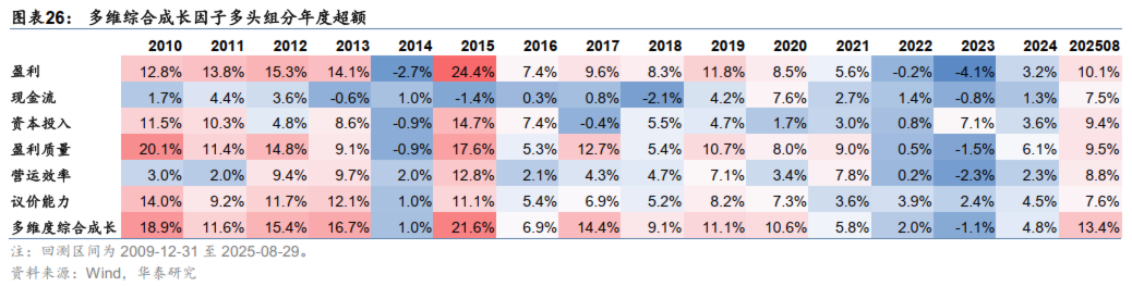 1、分年度看,多维综合成长因子在2015年、2017-2020年等成长风格强势年份能获取较高超额,在2021-2024年成长风格沉寂时也展现出一定的防守性。2025年初至8月底多头组超额收益13.4%,总体表现较优;