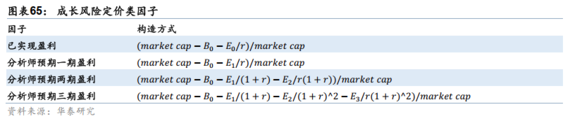 其中稳定盈利价值采用两种构造方式,分别使用已实现净利润和分析师预期净利润作为无增长盈利的代理变量。而对于折现率,因为假定企业成长风险价值均计入公式第三项,所以对于无增长状态可以简化认为不同企业的折现率均为固定值。几种成长风险定价因子的具体构造方式和测试结果汇总如下。