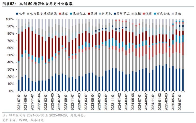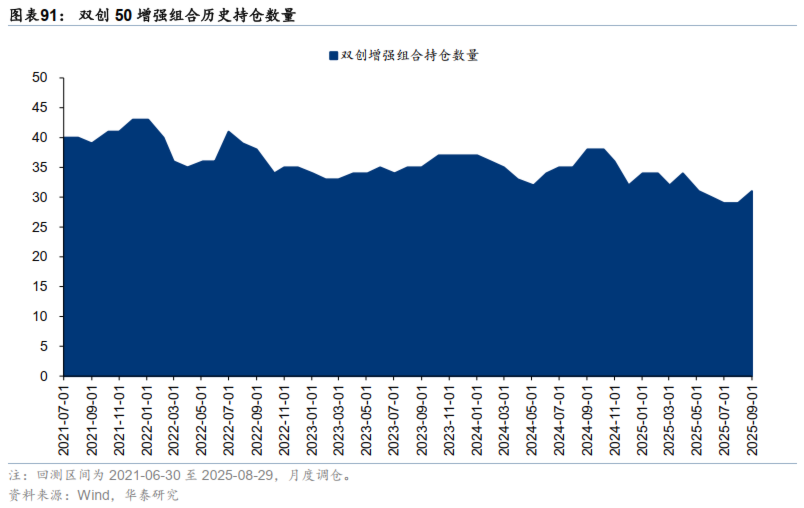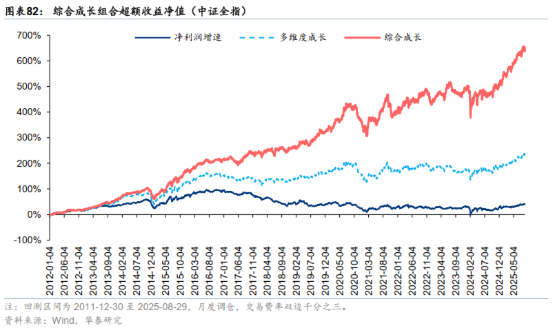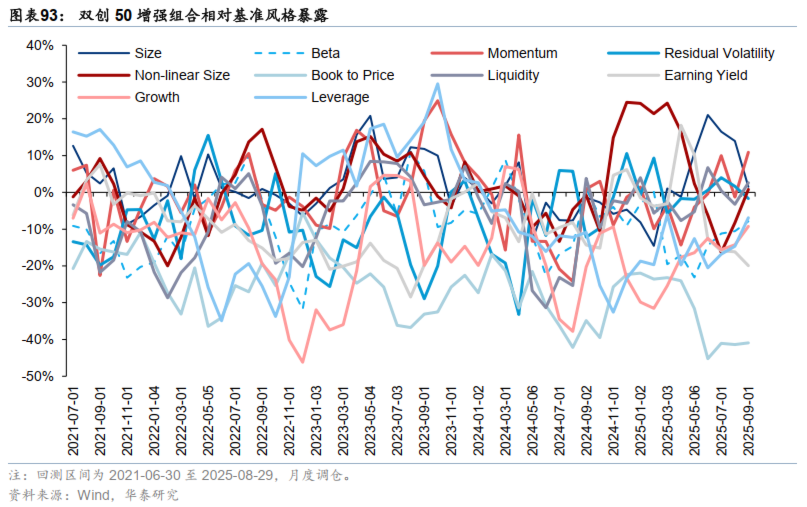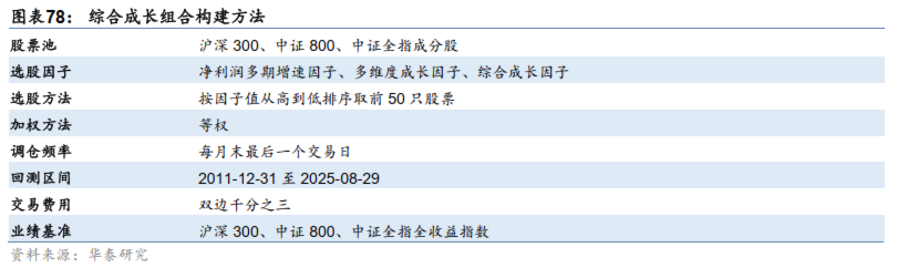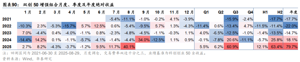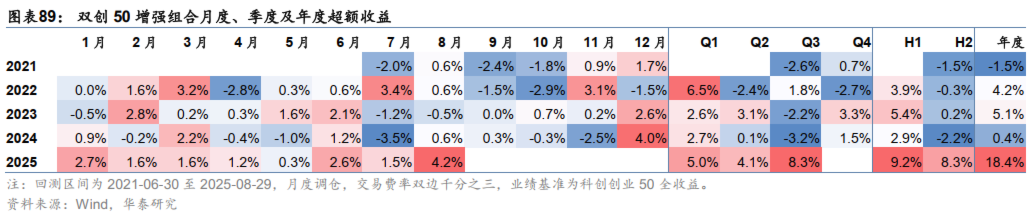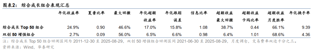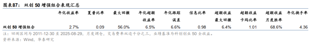进一步基于改进后综合成长因子构建中证全指综合成长Top 50组合以及双创50增强组合,均取得较优业绩。其中双创50增强组合月频调仓,年化双边换手率约4倍,全区间内相对科创创业50全收益指数可获约6.5%的稳定超额,2025年截至8月底共获18.4%超额收益,绝对收益高达79.7%。