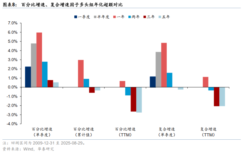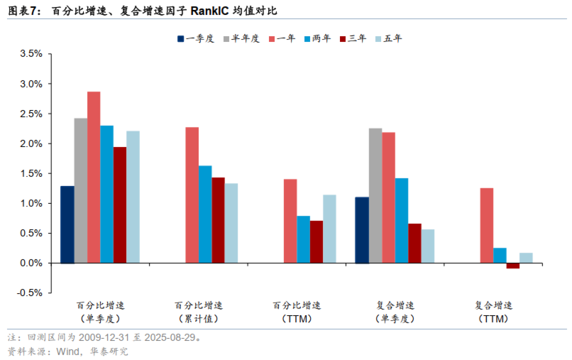 首先观察对于百分比增速、复合增速两种基础构建方法,不同财务指标计算口径及时间窗口长度下的因子表现。