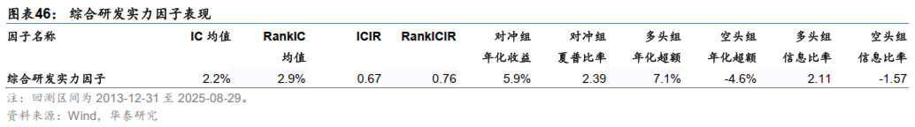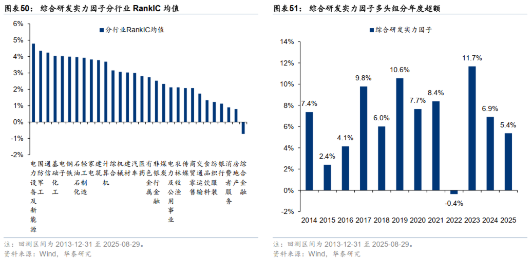 进一步测试综合研发实力因子分行业以及分年度表现如下。分行业看,该因子在电新、军工、通信、化工、电子等研发强度高、科技属性强的行业内表现突出;分年度看,该因子多头组在测试区间的12个年度内胜率较高,仅2022年未取得正超额。