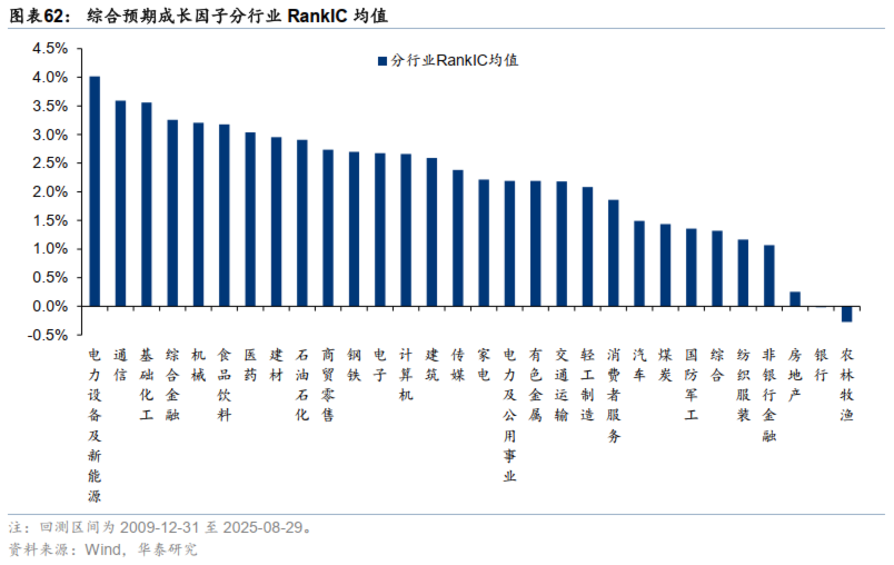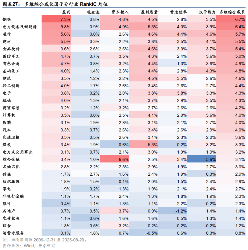2、分行业看,多维综合成长因子在电新、通信等高科技、高成长板块表现突出。同时,各行业的关键成长维度也有所差异,如钢铁行业相对看重盈利增长,而电新行业相对看重资本投入规模的扩张。