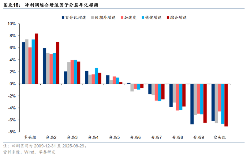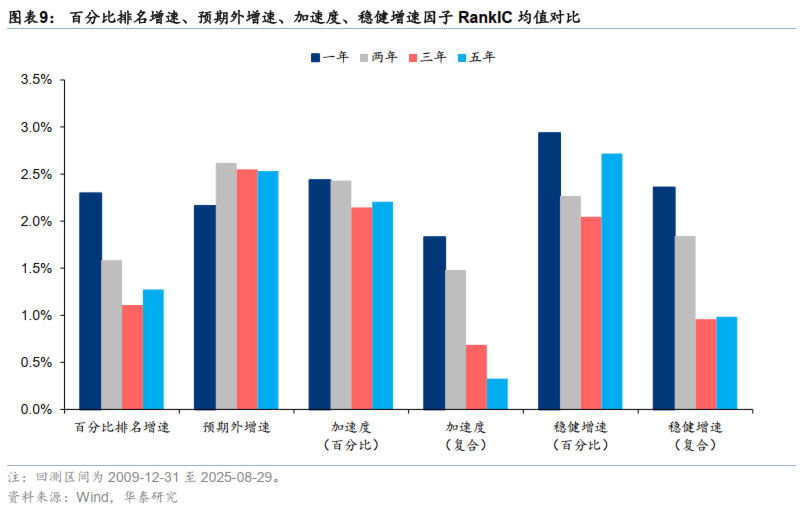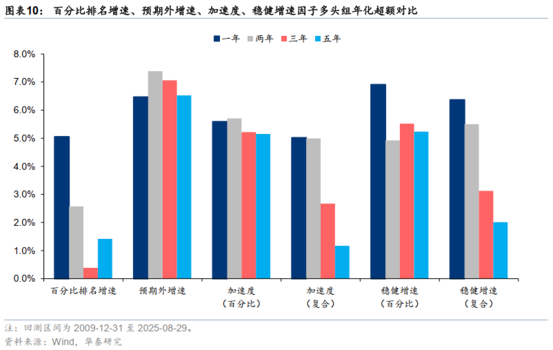 可以发现,不同的成长性衡量方法均有效。在一年的时间窗口尺度上,各因子均表现较优,其中预期外增速、以百分比增速计算的加速度和稳健增速在较长尺度的时间窗口内也有不错表现。而对于加速度和稳健增速,回归取斜率方法计算的复合增速在各时间窗口尺度上依然普遍不及百分比增速,进一步验证了前文结论。