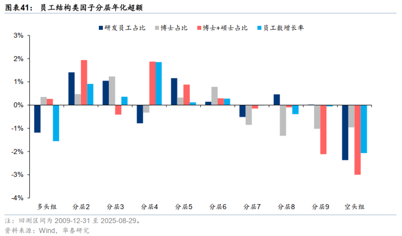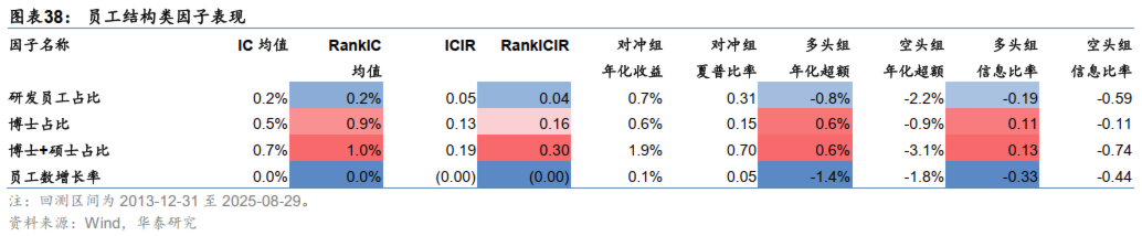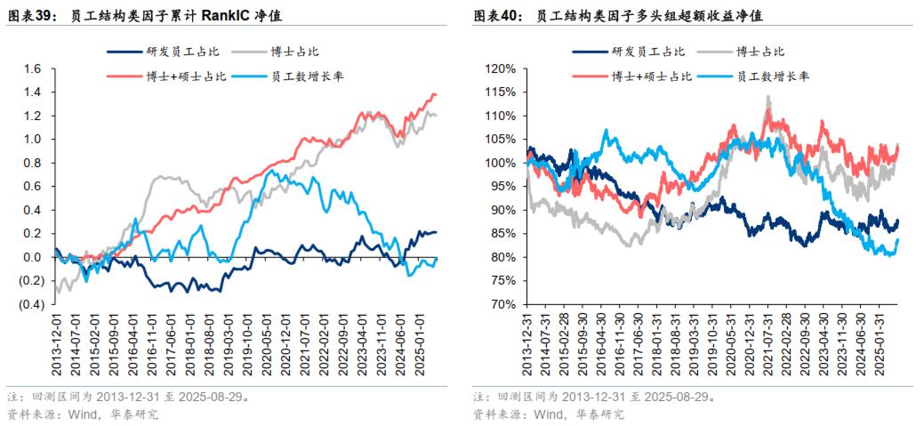 本小节对企业研发人员占比、高学历员工占比等因子进行测试,结果如下。