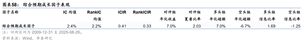本小节基于以上几个维度的因子合成综合预期成长因子。将净利润和营业收入分析师预期增长率、短期预期值增速、长期预期值增速、长短期预期值增速差进行等权合成。其中,短期预期值增速、长期预期值增速因子均同时选取一季度、半年时间窗口因子进行等权合成,而长短期预期值增速差因子选取一年的时间窗口。综合预期成长因子测试结果如下。