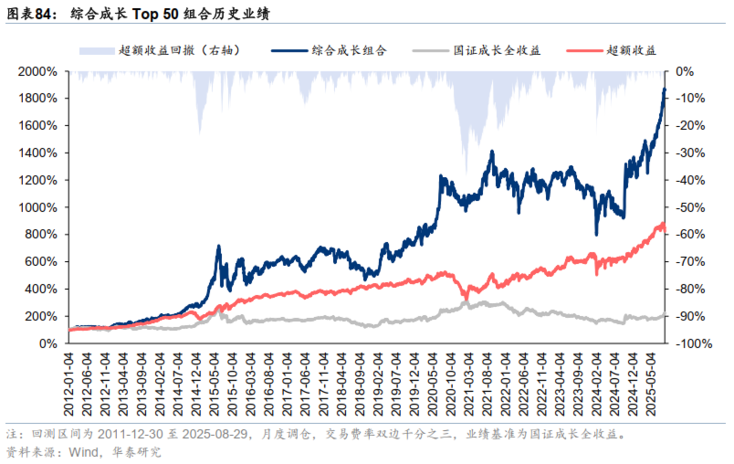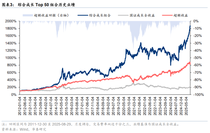 中证全指内基于综合成长因子构建的Top 50综合成长组合详细业绩展示如下。其中计算超额收益时将基准改为国证成长全收益指数(代码:399370),其他参数不变。