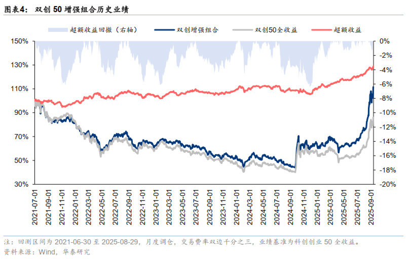基于该组合优化条件,构造双创50增强组合,业绩统计如下。
