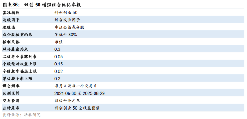 本小节尝试将综合成长因子用于更富科技含量的双创板块,构造双创板块增强组合。本节采用组合优化方式,选择基准指数为科创创业50指数(代码:931643),控制组合市值、二级行业与基准的偏离。组合优化的详细参数如下。