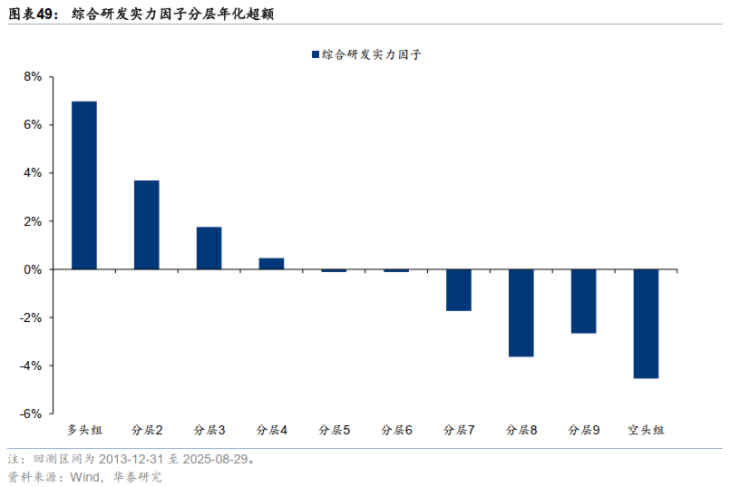 本小节基于以上几个维度的因子合成综合研发实力因子。其中,研发费用类选取研发、广告占市值比因子以及研发费用占净利润、收入比因子,与博士占比、专利技术占市值比共7个因子进行等权合成得到综合研发实力因子,测试结果如下。