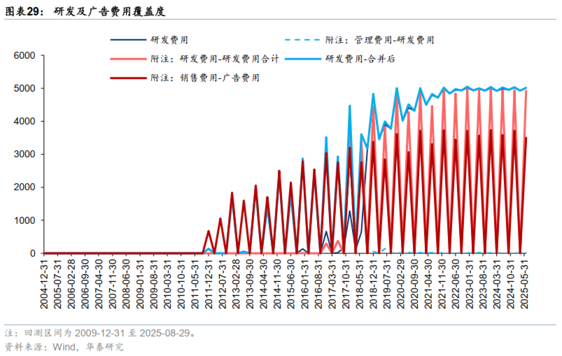从以上科目的覆盖度看,2012年至2018年来自财务报表附注中的研发费用有较完整的半年度披露,自2018年中报后经合并可逐渐保持季频的较完整覆盖;广告费用则自2011年起保持较完整的半年频覆盖。因此下文测试时,为保证数据质量统一将2013年底作为回测起始日期。