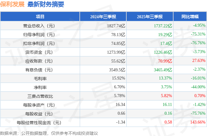 据证券之星公开数据整理,近期保利发展(600048)发布2025年三季报。根据财报显示,保利发展净利润同比下降75.31%。截至本报告期末,公司营业总收入1737.22亿元,同比下降4.95%,归母净利润19.29亿元,同比下降75.31%。按单季度数据看,第三季度营业总收入568.65亿元,同比上升30.65%,第三季度归母净利润-7.82亿元,同比下降299.19%。