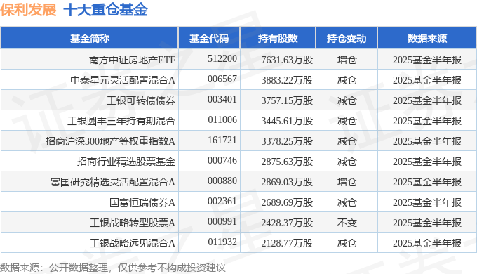 持有保利发展最多的基金为南方中证房地产ETF,目前规模为62.32亿元,最新净值1.6532(10月22日),较上一交易日上涨0.69%,近一年上涨8.62%。该基金现任基金经理为罗文杰。