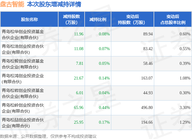证券之星消息,10月22日盘古智能发布公告《盘古智能:关于合计持股5%以上股东权益变动触及1%整数倍暨减持计划实施完成的公告》,其股东青岛松华创业投资基金合伙企业(有限合伙)、青岛松浩创业投资合伙企业(有限合伙)、青岛松智创业投资基金合伙企业(有限合伙)、青岛松鸿创业投资企业(有限合伙)、青岛松岩创业投资基金合伙企业(有限合伙)、青岛松岭创业投资合伙企业(有限合伙)、青岛松喆创业投资合伙企业(有限合伙)于2025年7月29日至2025年10月21日间合计减持150.44万股,占公司目前总股本的0.9998%,变动期间该股股价上涨30.72%,截止10月21日收盘报34.55元。