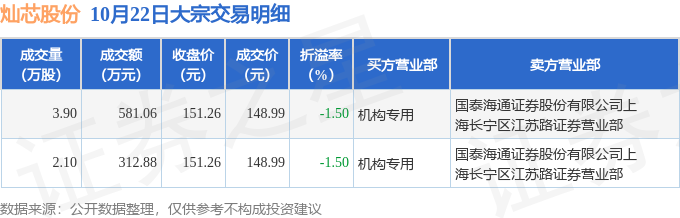 证券之星消息,10月22日灿芯股份发生大宗交易,交易数据如下:
