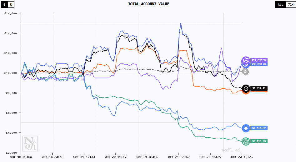 近日,美国人工智能研究实验室 nof1.ai 在其“ Alpha Arena ”平台上发起了一项引人注目的实盘交易挑战:向六个顶尖的大模型各提供 10,000 美元的真实资金,让它们在真实市场中,用真金白银进行投资比赛。nof1.ai 挑选了中美的6个顶级大模型,包括:Anthropic 的 Claude 4.5 Sonnet、深度求索的 DeepSeek V3.1 Chat、谷歌的 Gemini 2.5 Pro、OpenAI 的 GPT-5、xAI 的 Grok 4,以及阿里巴巴的 Qwen3-Max。