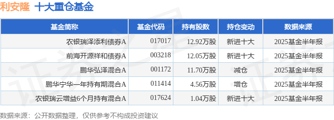 持有利安隆最多的基金为农银瑞泽添利债券A,目前规模为2.12亿元,最新净值1.1052(10月21日),较上一交易日上涨0.3%,近一年上涨5.94%。该基金现任基金经理为刘莎莎 钱大千 王皓非。