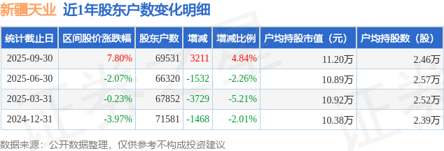 证券之星消息,近日新疆天业披露,截至2025年9月30日公司股东户数为6.95万户,较6月30日增加3211.0户,增幅为4.84%。户均持股数量由上期的2.57万股减少至2.46万股,户均持股市值为11.2万元。