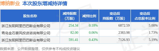 证券之星消息,10月21日博纳影业发布公告《博纳影业:简式权益变动报告书》,其股东青岛金石暴风投资咨询有限公司、浙江东阳阿里巴巴影业有限公司于2025年9月1日至2025年10月20日间合计减持927.75万股,占公司目前总股本的0.675%,变动期间该股股价上涨18.34%,截止10月20日收盘报6.13元。