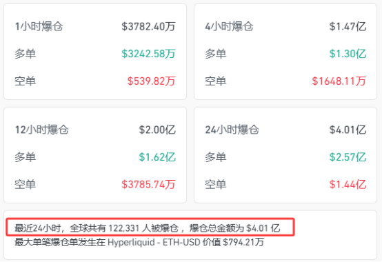 Coinglass数据显示,过去24小时,加密货币全网合约爆仓4.01亿美元,爆仓人数达到12.23万人,其中多单爆仓2.57亿美元,空单爆仓1.44亿美元。最大单笔爆仓单发生在Hyperliquid-ETH-USD,价值636.66万美元。