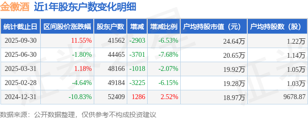 从股价来看,2025年6月30日至2025年9月30日,金徽酒区间涨幅为11.55%,在此期间股东户数减少2903.0户,减幅为6.53%。
