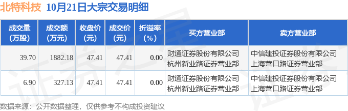 证券之星消息,10月21日北特科技发生大宗交易,交易数据如下:
