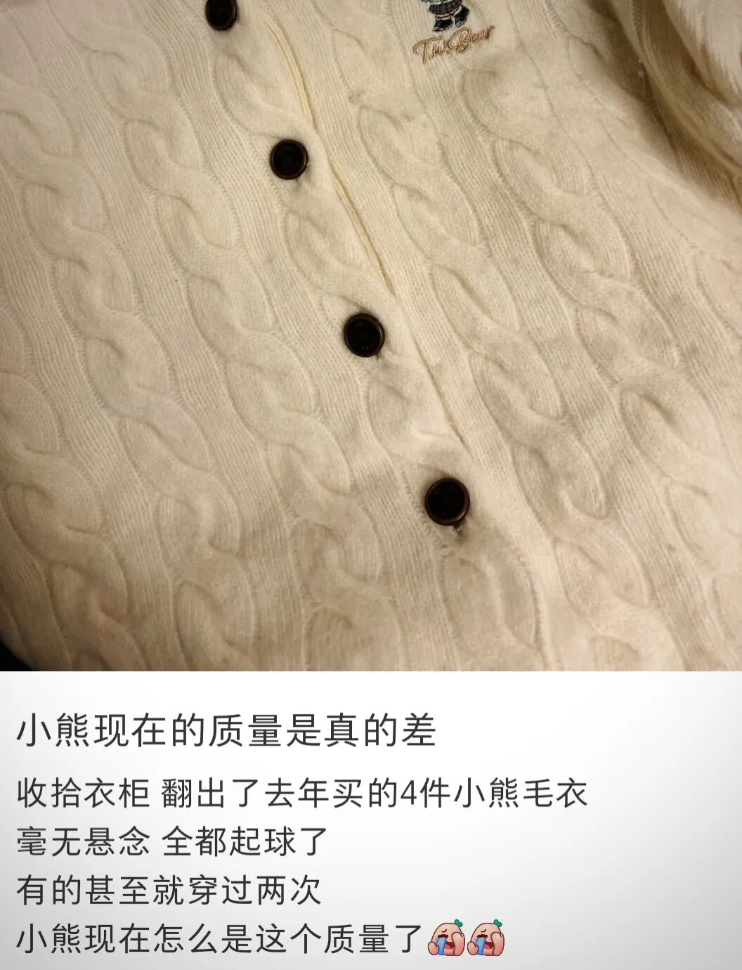 品牌独特性是0,品质才是前面的1。就拿最关键的质量细节来说,有人吐槽,1500元购买的Teenie Weenie冲锋衣仅穿两三次,袖口扣袢就出现脱胶问题。哪怕是小熊卫衣,也有老粉吐槽“质量和板型没以前好了”。