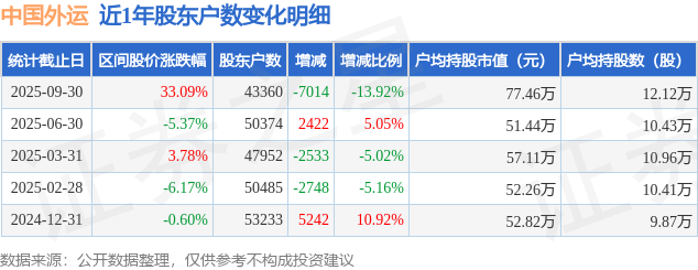 从股价来看,2025年6月30日至2025年9月30日,中国外运区间涨幅为33.09%,在此期间股东户数减少7014.0户,减幅为13.92%。