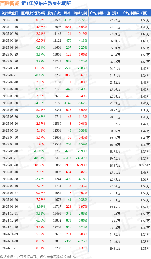 从股价来看,2025年10月10日至2025年10月20日,百胜智能区间涨幅为0.17%,在此期间股东户数减少1107.0户,减幅为8.72%。