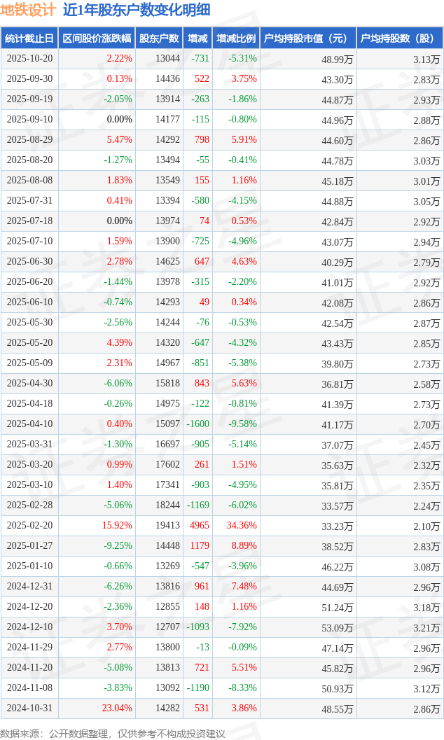 从股价来看,2025年9月30日至2025年10月20日,地铁设计区间涨幅为2.22%,在此期间股东户数减少731.0户,减幅为5.31%。