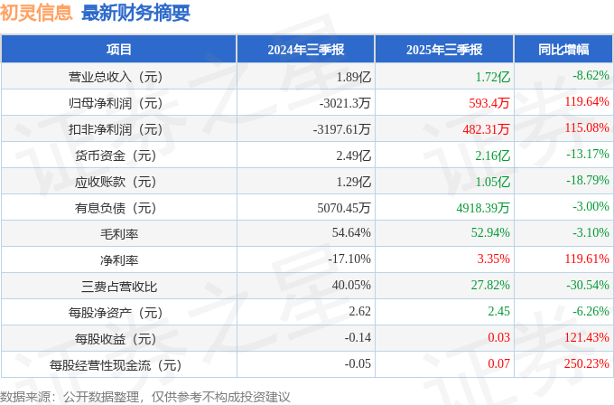 据证券之星公开数据整理,近期初灵信息(300250)发布2025年三季报。截至本报告期末,公司营业总收入1.72亿元,同比下降8.62%,归母净利润593.4万元,同比上升119.64%。按单季度数据看,第三季度营业总收入5781.93万元,同比下降9.38%,第三季度归母净利润248.72万元,同比上升123.93%。本报告期初灵信息公司应收账款体量较大,当期应收账款占最新年报营业总收入比达41.78%。