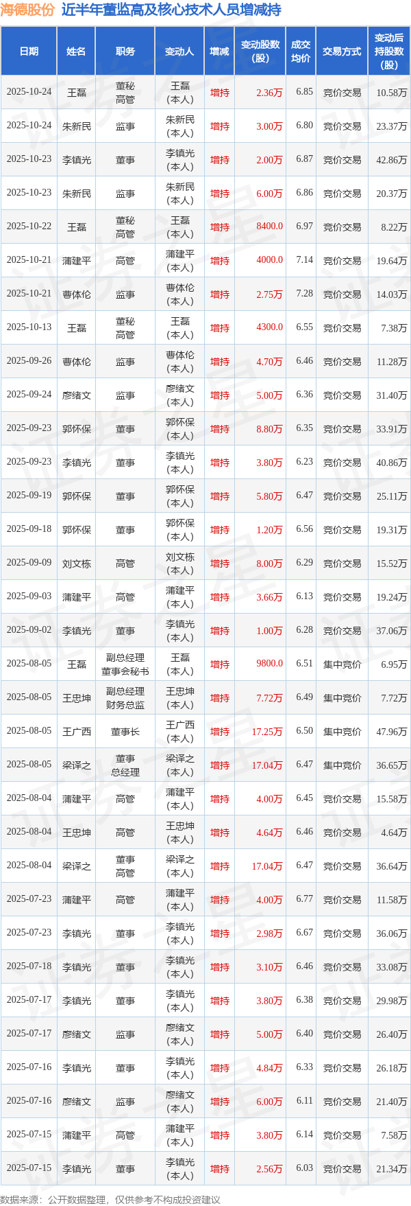 海德股份近半年内的董监高及核心技术人员增减持详情如下: