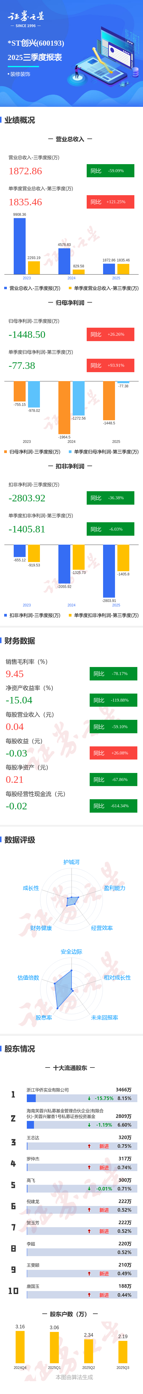 证券之星消息,*ST创兴2025年三季报显示,公司主营收入1872.86万元,同比下降59.1%;归母净利润-1448.5万元,同比上升26.27%;扣非净利润-2803.92万元,同比下降36.38%;其中2025年第三季度,公司单季度主营收入1835.46万元,同比上升121.25%;单季度归母净利润-77.38万元,同比上升93.92%;单季度扣非净利润-1405.81万元,同比下降6.04%;负债率83.76%,投资收益-194.29万元,财务费用297.11万元,毛利率9.45%。