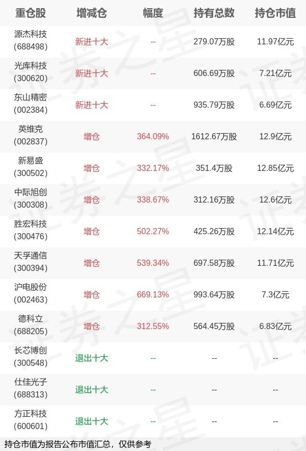 证券之星消息,10月27日中航基金旗下韩浩管理的中航机遇领航混合型发起式基金公布三季报,近1年净值增长率119.56%。与上一季度相比,该基金前十大重仓股新增源杰科技,光库科技,东山精密;并对英维克增仓1265.18万股,为该基金第一大重仓股;长芯博创,仕佳光子,方正科技等退出前十大重仓股;详细数据如下:以上内容为证券之星据公开信息整理,由AI算法生成(网信算备310104345710301240019号),不构成投资建议。