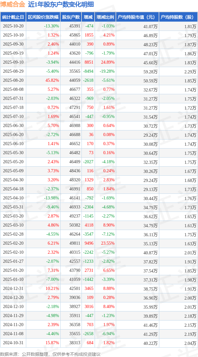 从股价来看,2025年10月10日至2025年10月20日,博威合金区间跌幅为13.3%,在此期间股东户数减少474.0户,减幅为1.03%。