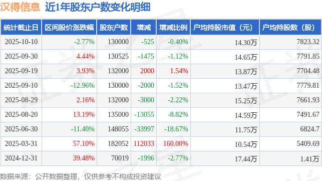 从股价来看,2025年9月30日至2025年10月10日,汉得信息区间跌幅为2.77%,在此期间股东户数减少525.0户,减幅为0.4%。