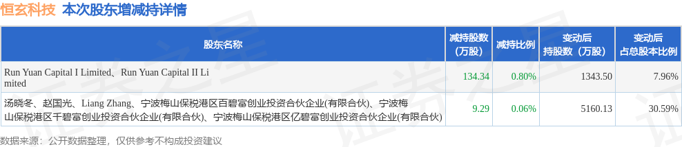 证券之星消息,10月27日恒玄科技发布公告《恒玄科技:关于股东权益变动触及1%暨减持股份结果公告》,其股东Run Yuan Capital I Limited、Run Yuan Capital II Limited、汤晓冬、赵国光、Liang Zhang、宁波梅山保税港区百碧富创业投资合伙企业(有限合伙)、宁波梅山保税港区千碧富创业投资合伙企业(有限合伙)、宁波梅山保税港区亿碧富创业投资合伙企业(有限合伙)于2025年7月28日至2025年10月24日间合计减持143.63万股,占公司目前总股本的0.8515%,变动期间该股股价上涨10.84%,截止10月24日收盘报280.54元。
