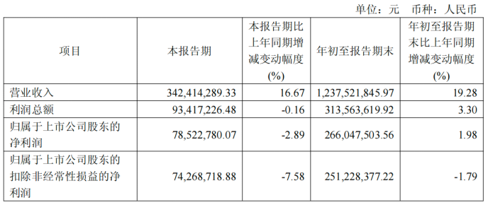 单季度数据显示,公司Q3实现营收3.42亿元,同比增长16.67%;归属净利润7852.28万元,同比下降2.89%;扣非净利润7426.89亿元,同比下降7.58%。