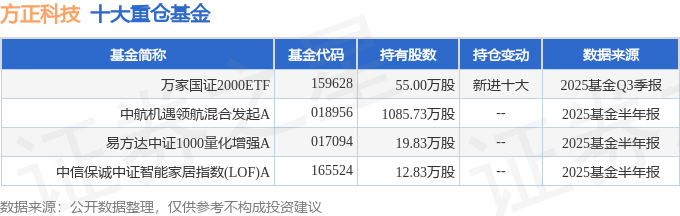 持有方正科技最多的基金为万家国证2000ETF,目前规模为12.86亿元,最新净值1.2874(10月24日),较上一交易日上涨1.32%,近一年上涨32.03%。该基金现任基金经理为杨坤。