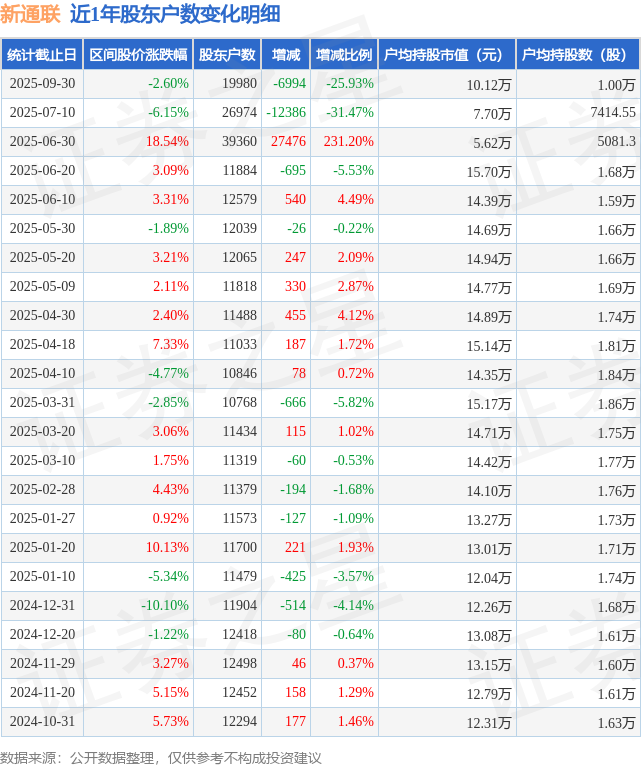 从股价来看,2025年7月10日至2025年9月30日,新通联区间跌幅为2.6%,在此期间股东户数减少6994.0户,减幅为25.93%。