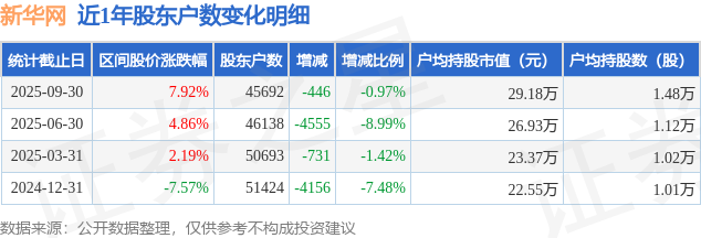 从股价来看,2025年6月30日至2025年9月30日,新华网区间涨幅为7.92%,在此期间股东户数减少446.0户,减幅为0.97%。