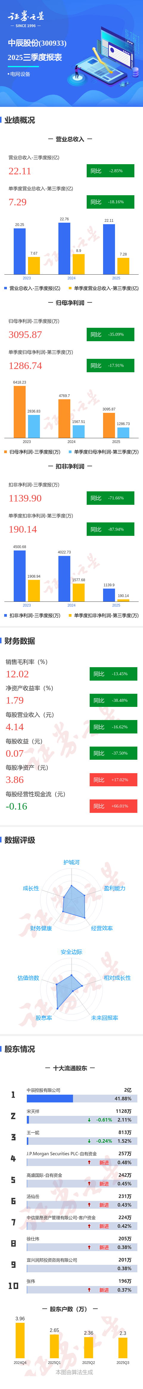 证券之星消息,中辰股份2025年三季报显示,公司主营收入22.11亿元,同比下降2.86%;归母净利润3095.87万元,同比下降35.09%;扣非净利润1139.9万元,同比下降71.66%;其中2025年第三季度,公司单季度主营收入7.29亿元,同比下降18.16%;单季度归母净利润1286.74万元,同比下降17.91%;单季度扣非净利润190.14万元,同比下降87.95%;负债率51.28%,投资收益1992.77万元,财务费用5526.13万元,毛利率12.02%。