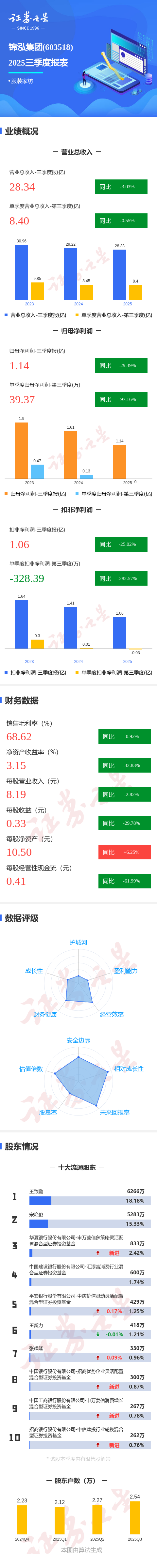 证券之星消息,锦泓集团2025年三季报显示,公司主营收入28.34亿元,同比下降3.03%;归母净利润1.14亿元,同比下降29.4%;扣非净利润1.06亿元,同比下降25.02%;其中2025年第三季度,公司单季度主营收入8.4亿元,同比下降0.55%;单季度归母净利润39.37万元,同比下降97.17%;单季度扣非净利润-328.39万元,同比下降282.57%;负债率37.05%,投资收益0.44万元,财务费用6851.2万元,毛利率68.62%。