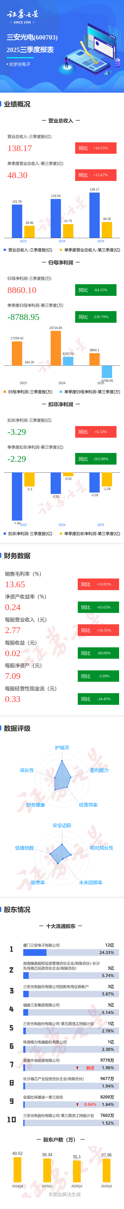证券之星消息,三安光电2025年三季报显示,公司主营收入138.17亿元,同比上升16.55%;归母净利润8860.1万元,同比下降64.15%;扣非净利润-3.29亿元,同比上升6.33%;其中2025年第三季度,公司单季度主营收入48.3亿元,同比上升15.67%;单季度归母净利润-8788.95万元,同比下降239.8%;单季度扣非净利润-2.29亿元,同比下降263.99%;负债率39.21%,投资收益-2.54亿元,财务费用1.04亿元,毛利率13.65%。
