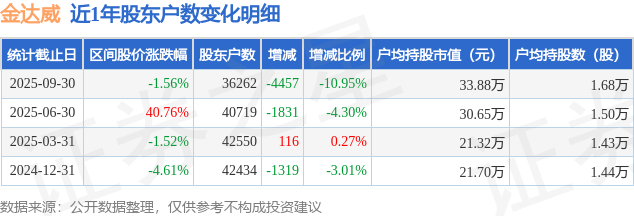 从股价来看,2025年6月30日至2025年9月30日,金达威区间跌幅为1.56%,在此期间股东户数减少4457.0户,减幅为10.95%。