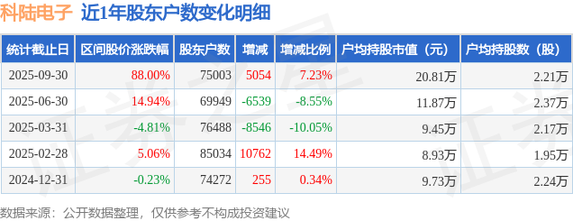 从股价来看,2025年6月30日至2025年9月30日,科陆电子区间涨幅为88.0%,在此期间股东户数增加5054.0户,增幅为7.23%。