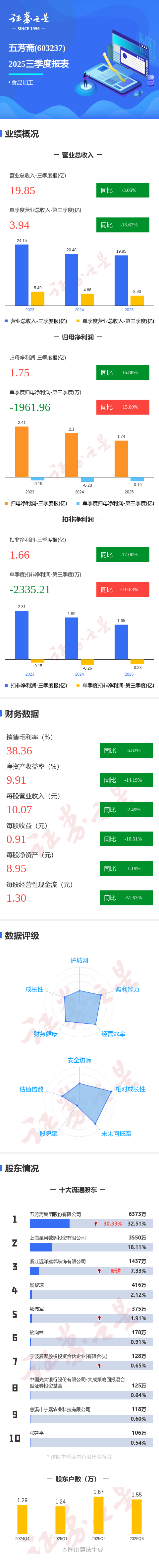 证券之星消息,五芳斋2025年三季报显示,前三季度公司主营收入19.85亿元,同比下降3.06%;归母净利润1.75亿元,同比下降16.89%;扣非净利润1.66亿元,同比下降17.0%;其中2025年第三季度,公司单季度主营收入3.94亿元,同比下降15.68%;单季度归母净利润-1961.96万元,同比上升15.01%;单季度扣非净利润-2335.21万元,同比上升10.64%;负债率26.45%,投资收益204.12万元,财务费用225.78万元,毛利率38.36%。