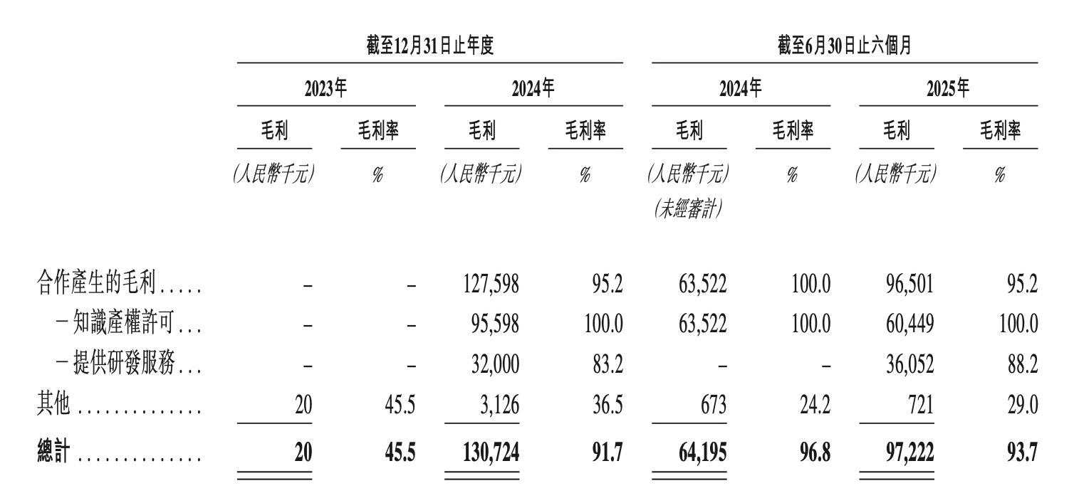 这两笔交易立竿见影地改善了瑞博生物的财务报表:2024年营收从2023年几乎可以忽略不计的4.4万元猛增至1.43亿元,正有它们的功劳。公司的毛利率也随之从2023年的45.4%一路飙升至2025年上半年的93.6%。