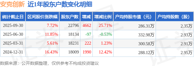 从股价来看,2025年6月30日至2025年9月30日,安克创新区间涨幅为7.72%,在此期间股东户数增加4662.0户,增幅为25.71%。